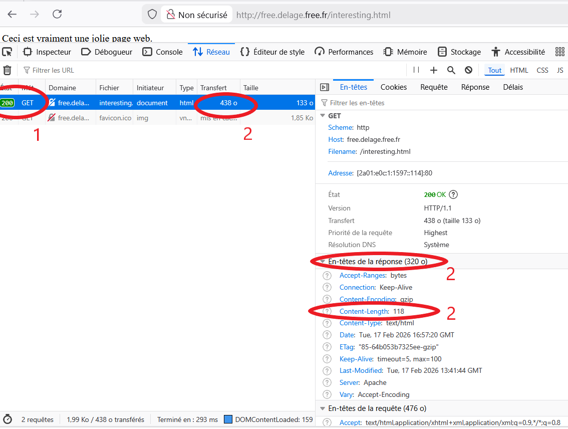 http://free.delage.free.fr/interesting.htmla généré un code de réponse 200 OK, ce qui signifie que la requête a été traitée et que la réponse contenant la page a été envoyée.