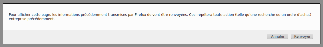 - ont vocation à provoquer des changements sur le serveur. Ainsi, un ordre d'achat sur un site de commerce sera nécessairement passé par une méthode POST. Les navigateurs préviennent alors le risque de «double commande» lors d'une actualisation malencontreuse de la page par l'utilisateur par la fenêtre :